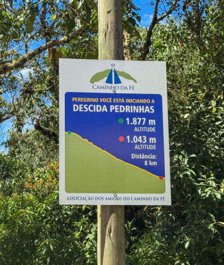 Ao longo do Caminho da Fé, a altimetria acumulada de descidas ultrapassa 10 mil metros de desnível ao longo de toda a rota entre Águas da Prata e Aparecida. São diversos morros que subimos e descemos durante todo o percurso, que em sua maior parte é feito cortando a Serra da Mantiqueira.